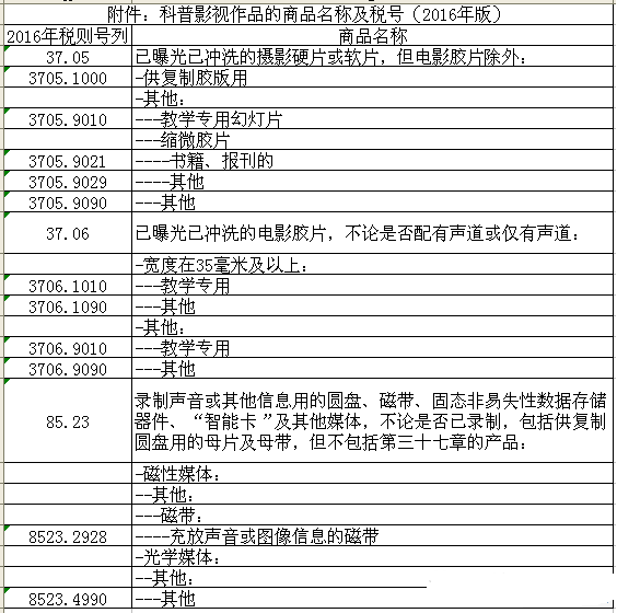 科普影视作品的商品名称及税号(2016年版)
