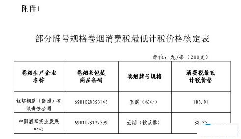 1. 部分牌号规格卷烟消费税最低计税价格调整表