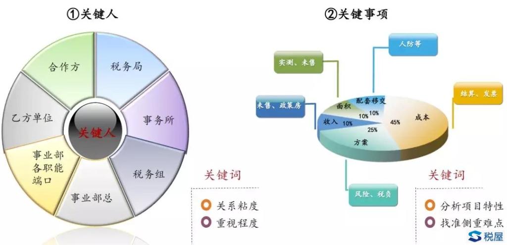 第一,关键人。细分为7个组成部分,从关系粘度和重视程度上要面面俱到、密切跟进,比如和乙方单位高效的配合,保证未付款发票取票率95%以上,最大化将总成本计入清算范围,降低税负。