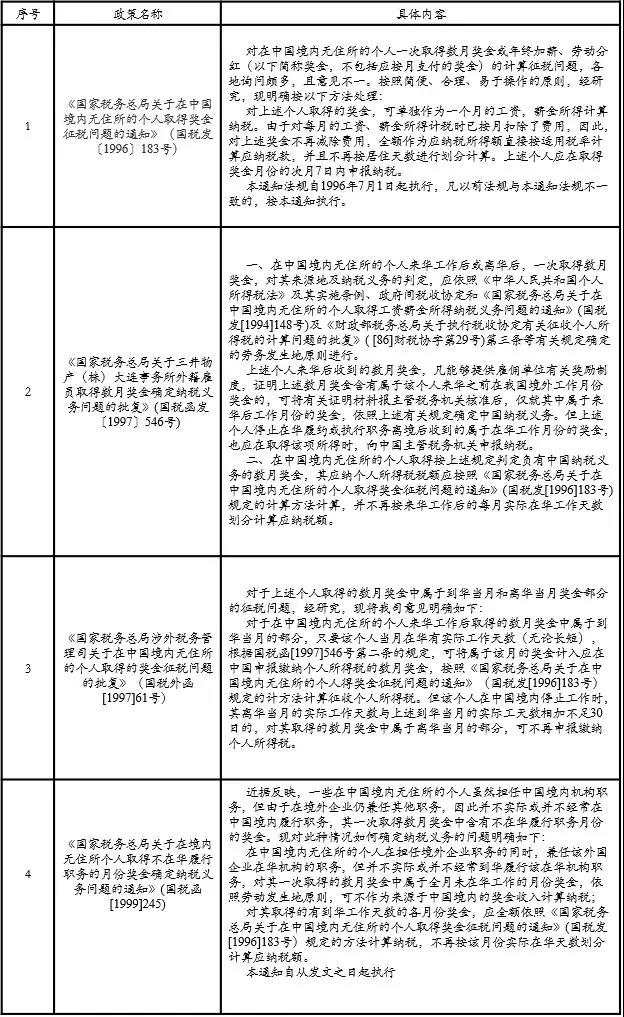 关于年终一次性奖金问题,原先非居民个人是可以和税收居民个人一样,适用《国家税务总局关于调整个人取得全年一次性奖金等计算征收个人所得税方法问题的通知》(国税发〔2005〕9号)规定,即对于全年一次性奖金,可以除以12找税率后,按月税率表和对应的速算扣除数缴纳个人所得税。