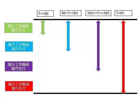 但是,很奇怪的是,为什么35号公告对于高管人员在境内居住时间累计不超过90天的情形只是规定了文字性规定,且没有给出计算公式呢?看我的独创“四色图”你就发现,在不超过90天的情况下,他的纳税义务是绿色+紫色,大家自己就可以看一下: