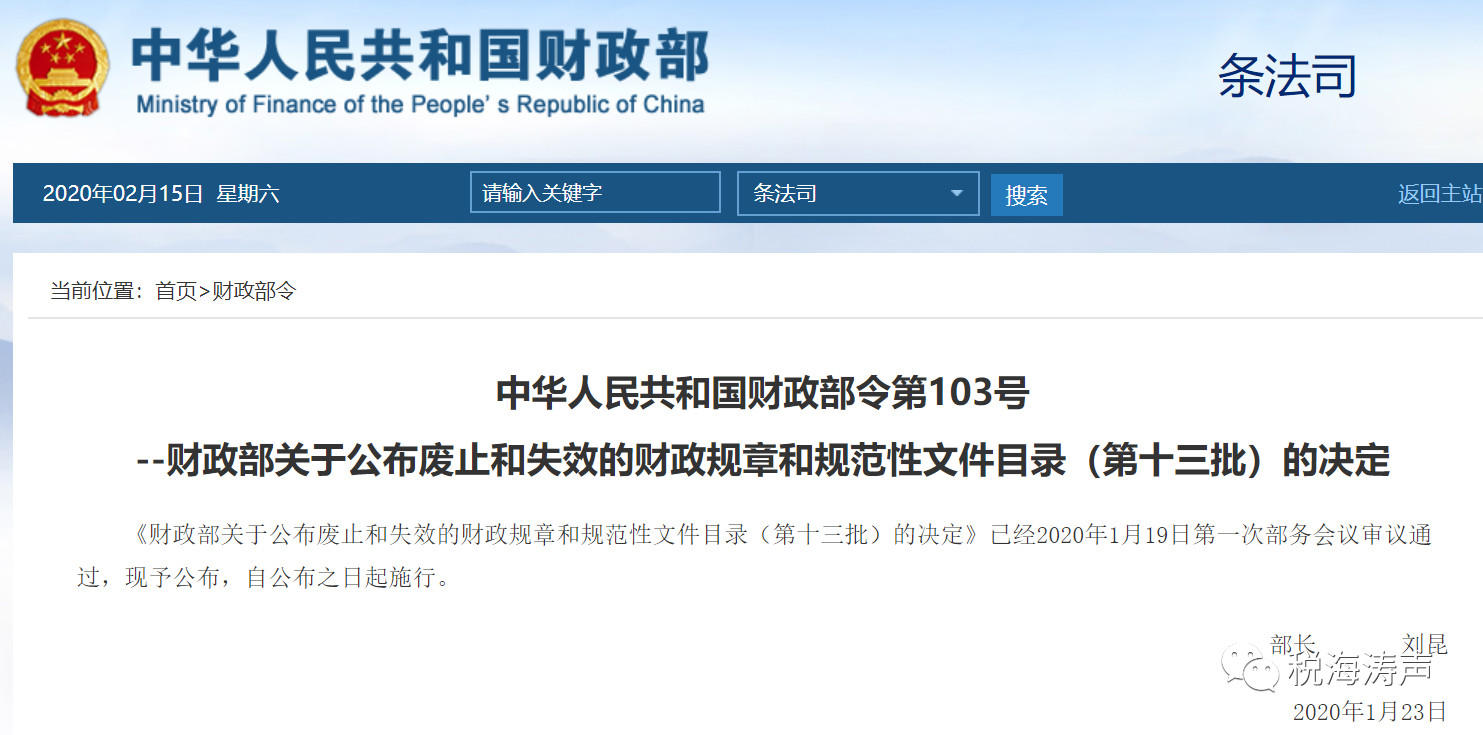 今年初,财政部以第103号令公布了《财政部关于公布废止和失效的财政规章和规范性文件目录(第十三批)的决定》,共有796件财政规章和规范性文件宣布废止和失效。在所公布废止的规章中,有两部税收暂行条例的实施细则被宣布废止,在此提请大家注意: