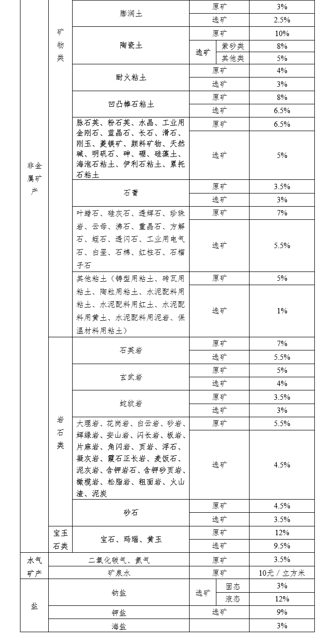2、税目税率。税法第二条规定:资源税的税目、税率,依照《税目税率表》执行。《税目税率表》中规定实行幅度税率的,其具体适用税率由省、自治区、直辖市人民政府统筹考虑该应税资源的品位、开采条件以及对生态环境的影响等情况,在《税目税率表》规定的税率幅度内提出,报同级人民代表大会常务委员会决定,并报全国人民代表大会常务委员会和国务院备案。《税目税率表》中规定征税对象为原矿或者选矿的,应当分别确定具体适用税率。