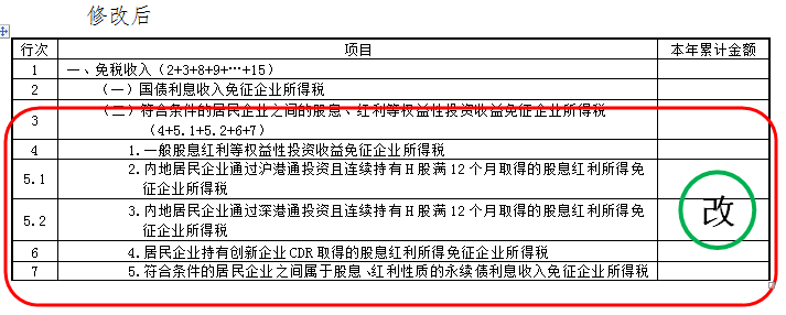 2.第5行项目名称修改为“符合条件的居民企业之间的股息、红利等权益性投资收益免征企业所得税(6+7.1+7.2+8+9)”;