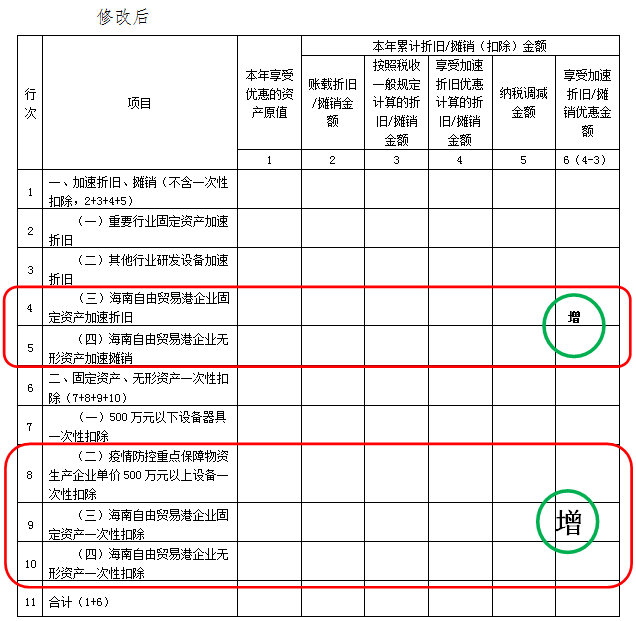 新增第9行项目名称修改为“(三)海南自由贸易港企业固定资产一次性扣除”;