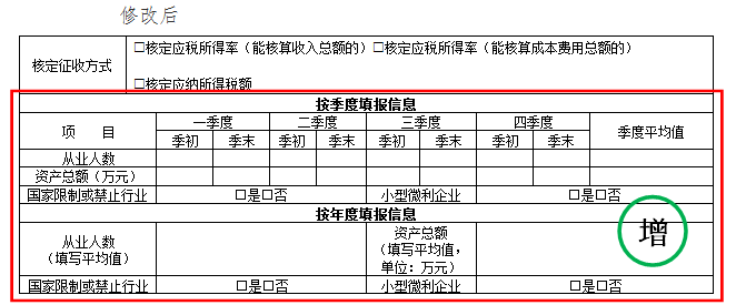 2.为优化填报口径,将“按季度填报信息”“按年度填报信息”部分前移,并扩充“从业人数”和“资产总额”栏次,列示第一季度至税款所属季度的各季度季初值、季末值、季度平均值,方便纳税人在申报时修正之前季度的错报数据。