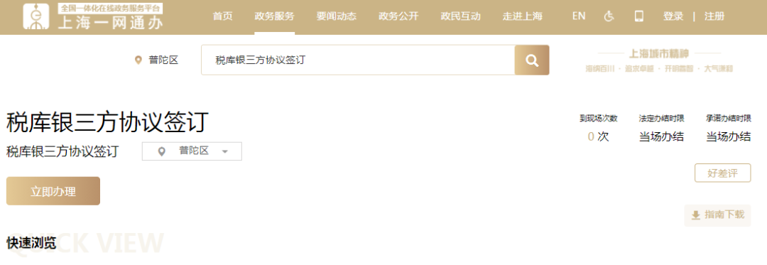 企业登录【上海一网通办】,在【政务服务】中按主题或按部门,选择涉税事项相关内容,或在搜索框中输入“存款账户账号报告”或“税库银三方协议签订”,定位到具体办事指南,点击“立即办理”按钮,以单点登录方式跳转至上海市电子税务局功能节点,无须二次登录,完成存款账户报告及三方协议签订。具体可参考上海市电子税务局操作。