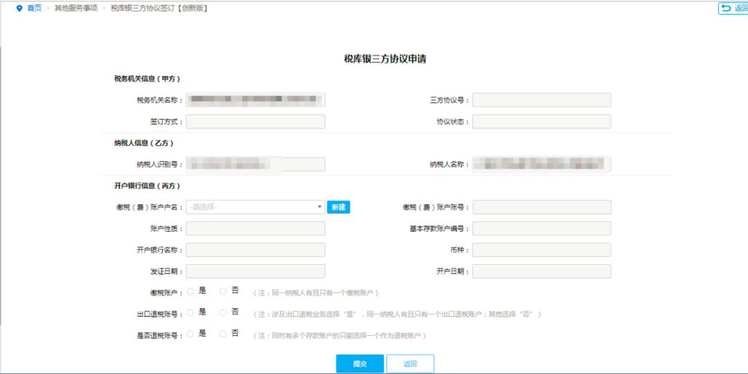 点击“新增”按钮,进入税库银三方协议申请界面,缴款(费)账户账号中选择需要签订三方协议的银行账号信息。系统将根据纳税人已登记的存款账户信息自动带出相关数据。核对信息无误后,点击“提交”按钮。