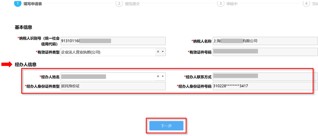 填写申请表:页面自动会带出纳税人基本信息,选择办税员,完成后点击[下一步]