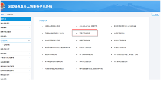 在跳出页面中选择[开具无欠税证明],点击进入办理页面