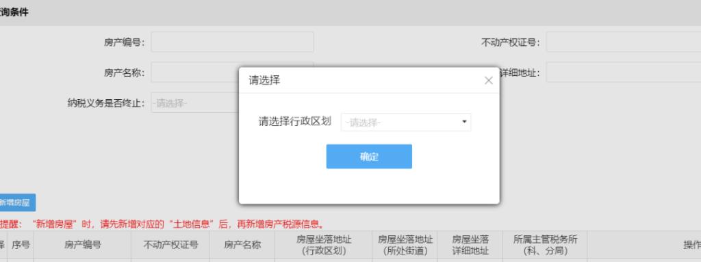 (1)点击“房产税税源明细”,点击“新增房屋”选择行政区划。