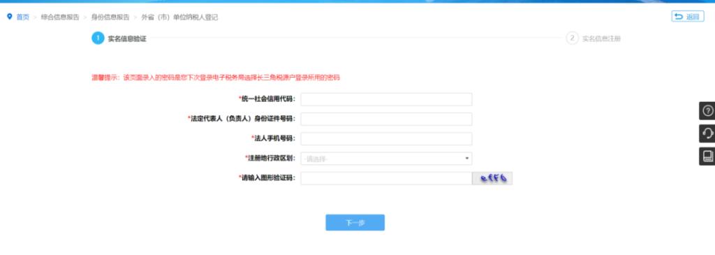 页面所有字段都是必填项。填写完毕,点击[下一步]按钮提交当前输入的数据进行验证是否能查到该企业信息。验证通过则到下一步进行实名信息注册。