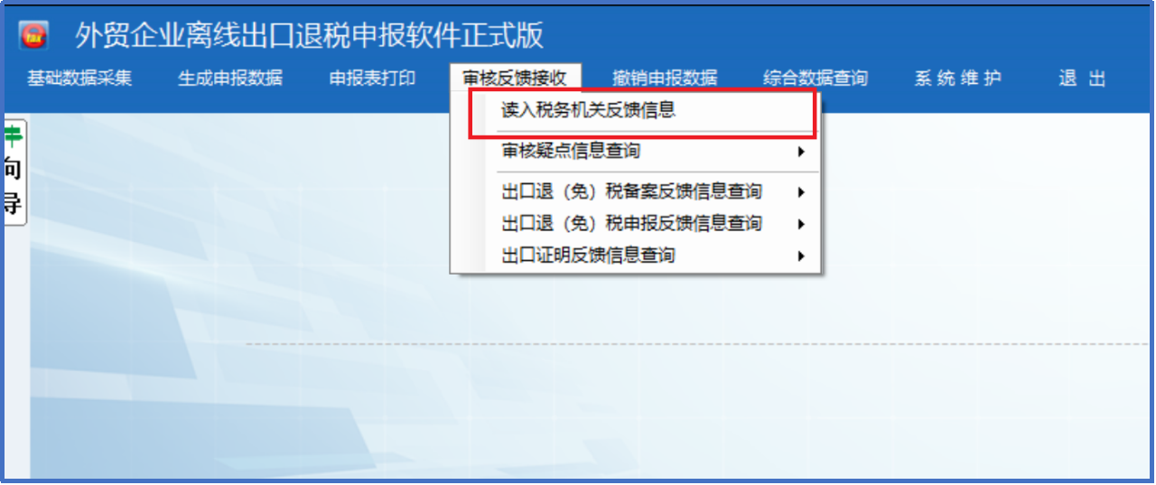 在离线版申报软件“审核反馈接收”目录下选择“读入税务机关反馈信息”,将刚才下载的反馈读入即可。
