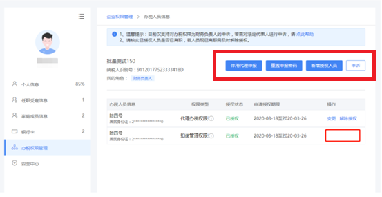 3、添加成功后,可对有操作权限的人员信息进行变更和解除授权。