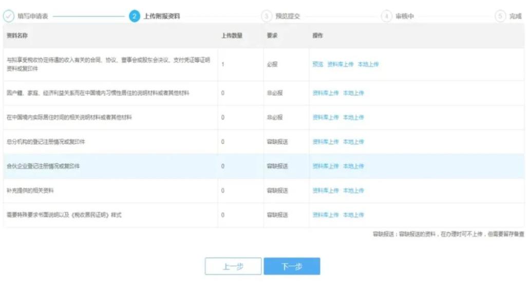 必报类资料为必须上传,非必报类根据对应申请材料进行上传;完成后点击【下一步】。