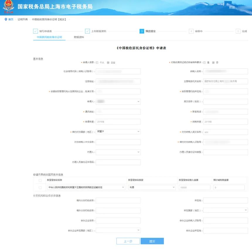 填写《中国税收居民身份证明》申请表: