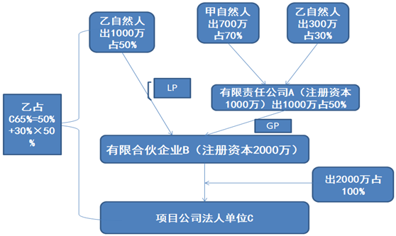 4、从图中的出资比例分配的股权比例来看,乙自然人在项目公司法人单位C占有的股份比例为:65%(直接持股比例50%+间接持股比例30%×50%)。