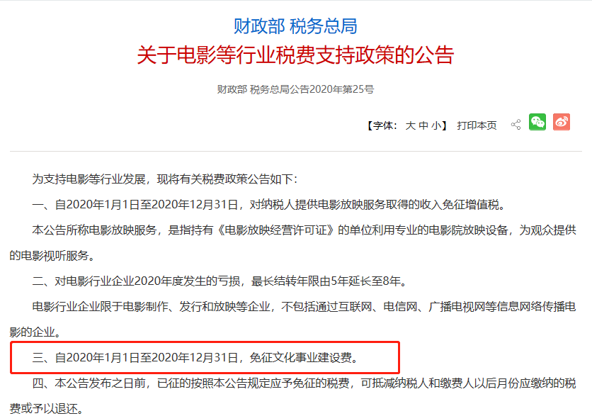 财政部 税务总局公告2020年第25号规定,自2020年1月1日至2020年12月31日,免征文化事业建设费。