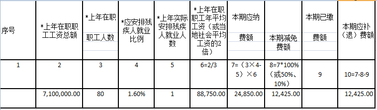 又比如:二哥税税念公司2020年工资总额710万,职工人数80人,四川省要求的残疾人就业安排比例是1.6%,实际公司安排残疾人1人,安置比例小于1.6%,但是大于1%(实际是1.25%),那实际我们就只按照应纳费额的50%缴纳,相当于减免了50%的费用。