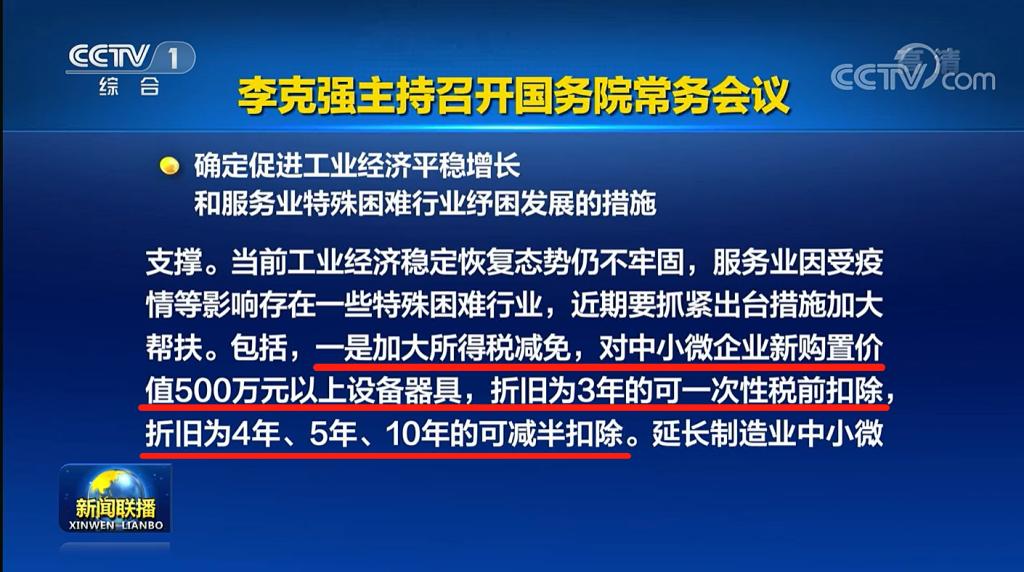 元宵日国常会决定,价值500万以上的设备器具,也可以一次性扣除