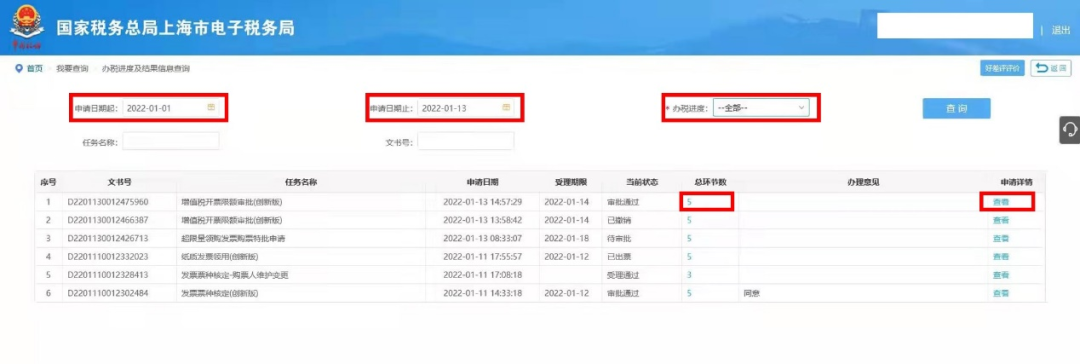 3.选择申请事项的对应【总环节】可查看此事项总体审批环节与进度,点击“申请详情”【查看】可查看并下载相关“税务事项通知书”。