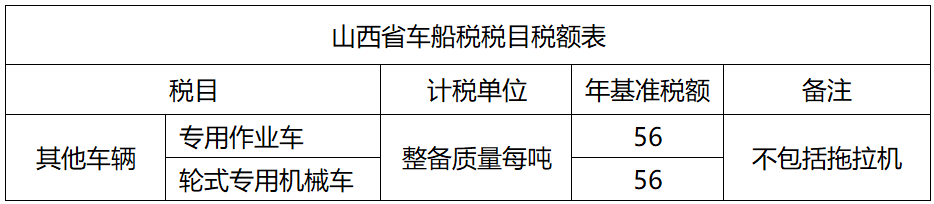 经咨询办税人员,企业税务人员应当登录税务征管系统,登记未缴纳车船税的矿区胶轮车信息,并进行纳税申报。根据车船税暂行条例实施细则、车船税相关公告以及山西省车船税税目税额表可以判断出胶轮车属于运输设备中的“专用作业车”,山西省按照 “整备质量每吨”为计税单位,56元/吨申报缴纳车船税。