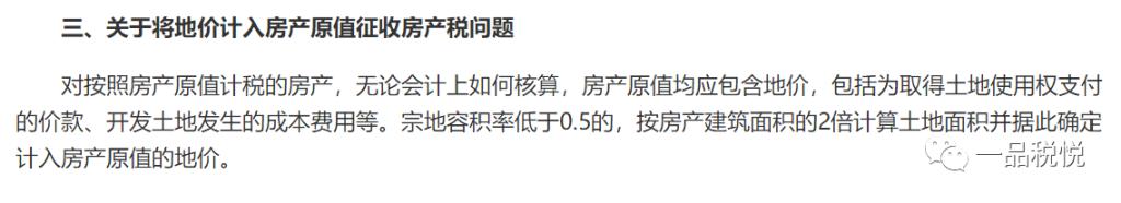 二是对宗地容积率大于0.5的,“无论会计上如何核算,房产原值均应包含地价”,即一律将全部地价计入房产原值。