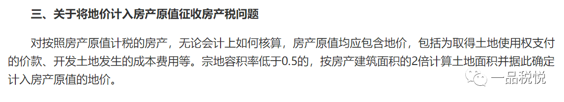 一是对“宗地容积率低于0.5的,按房产建筑面积的2倍计算土地面积并据此确定计入房产原值的地价。”这里主要是考虑到将地价计入房产原值后,部分单位如仓储、物流企业等由于生产经营的特殊性,占地面积大,可能税负增加较多,对这类“大地小房”的情况需给予一定照顾,允许其只将部分土地的地价计入房产原值征税,即按“房产建筑面积的2倍计算土地面积并据此确定计入房产原值的地价。”这样计算的话,可以少交房产税。