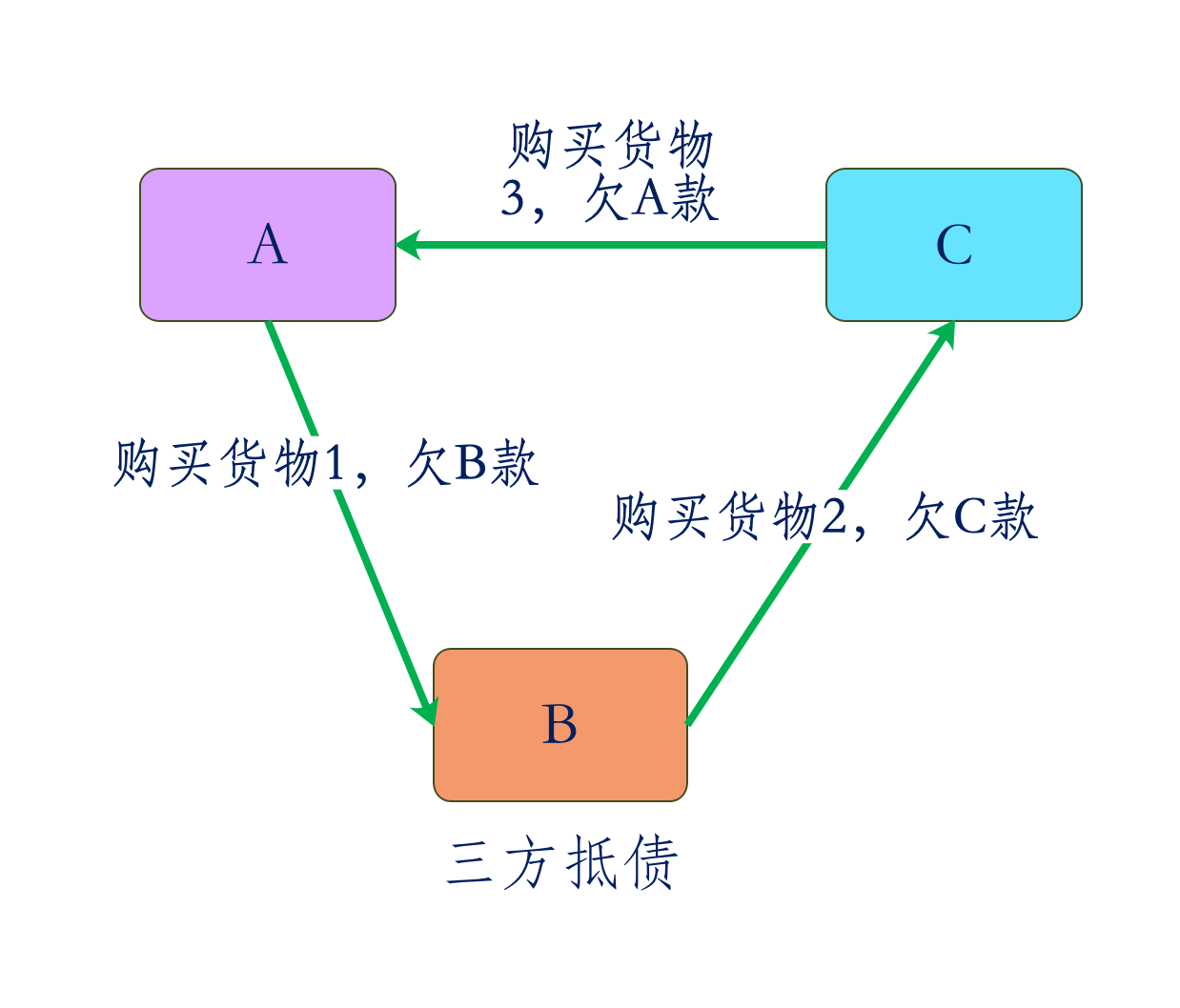 与商品购销是一样的道理,比如:A从B购买货物,欠款;B从C购买货物,欠款;能否B欠C的款由A来还?促成C从A真实购买货物,三方抵债,A支付B货款,B支付C货款,C支付A货款。