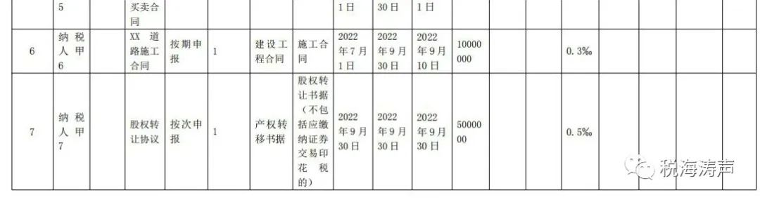 举例说明1:纳税人甲按季申报缴纳印花税,2022年第三季度书立买卖合同5份,合同所列价款(不包括列明的增值税税款)共计100万元,书立建筑工程合同1份,合同所列价款(不包括列明的增值税税款)共计1000万元,书立产权转移书据1份,合同所列价款(不包括列明的增值税税款)共计500万元。该纳税人应在书立应税合同、产权转移书据时,填写《印花税税源明细表》,在2022年10月纳税申报期,进行财产行为税综合申报,具体如下: