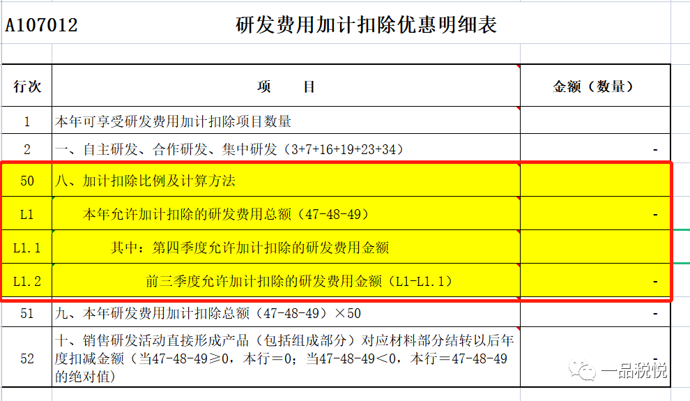 显然,甲公司选择按实际发生金额计算更为合适。那么,甲公司在填报《研发费用加计扣除优惠明细表》(A107012)时,应在第50行“八、加计扣除比例及计算方法”填入代码122,即“前三季度75%且第四季度100%(其他企业)按实际发生金额计算”,在L1行“本年允许加计扣除的研发费用总额”中填写“1200000”,L1.1行“其中:前四季度允许加计扣除的研发费用金额”中填写“400000”,在L1.2行“前三季度允许加计扣除的研发费用金额”中填写“800000”,在第51行“九、本年研发费用加计扣除总额”填写“1000000”。