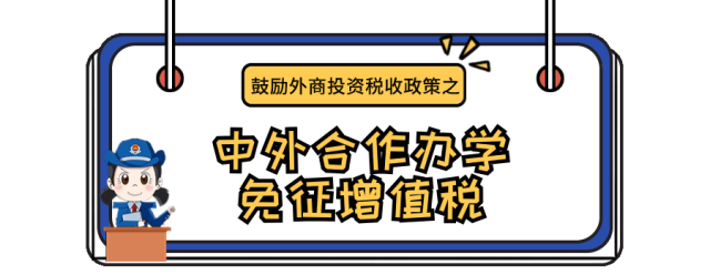 为充分发挥税收支持稳外贸稳外资工作的职能作用,国家税务总局对现行有效的相关税收支持政策和征管服务举措进行梳理更新,形成新版《稳外贸稳外资税收政策指引》并于1月15日对外发布。为方便纳税人更好了解政策、适用政策,为外贸外资发展营造良好税收环境,江苏税务将持续开展稳外贸稳外资税收政策系列专题宣传,今天带您了解中外合作办学免征增值税。
