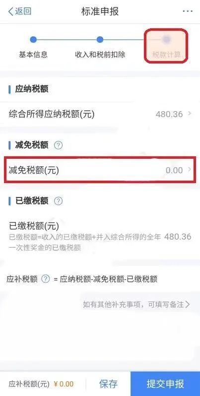 注意:录入的减免税额不能大于申报主表上的综合所得应纳税额。