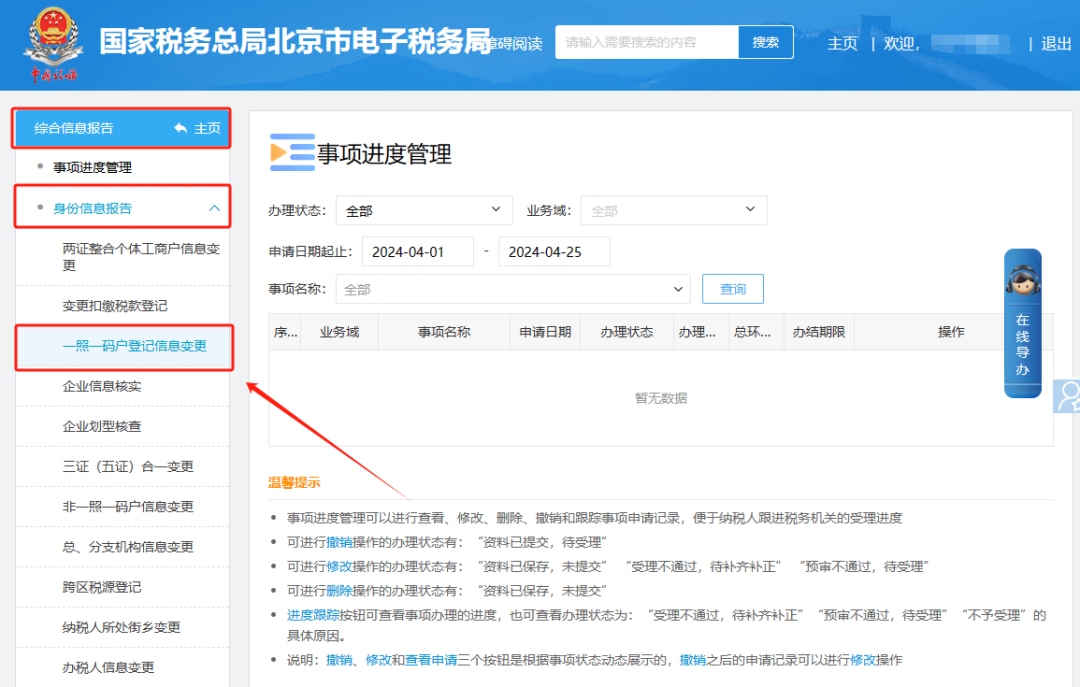 二、综合信息报告—身份信息报告—一照一码户登记信息变更。