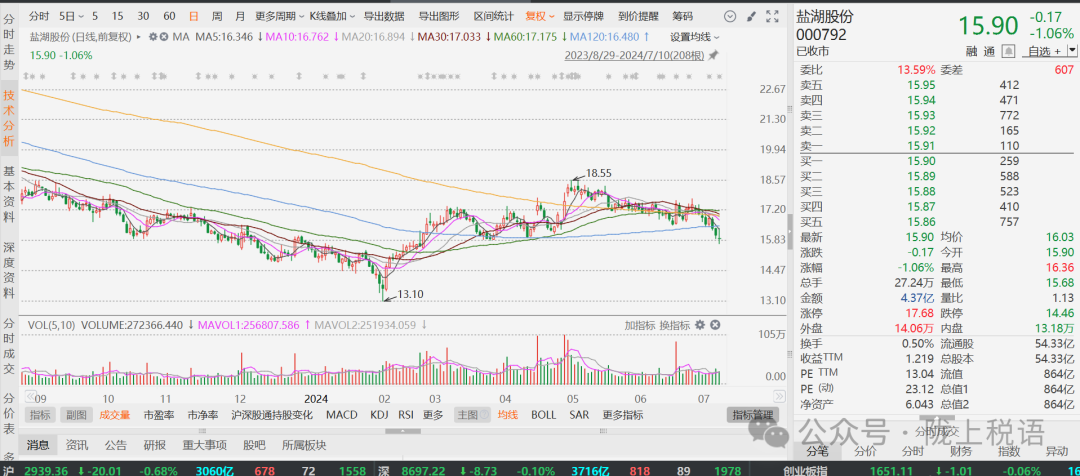 7月9日晚间,盐湖股份(股票代码:000792.SZ)发布2024年上半年业绩预告称,公司净利润或为17亿元~23亿元,将同比大幅下降66.65%至54.88%。
