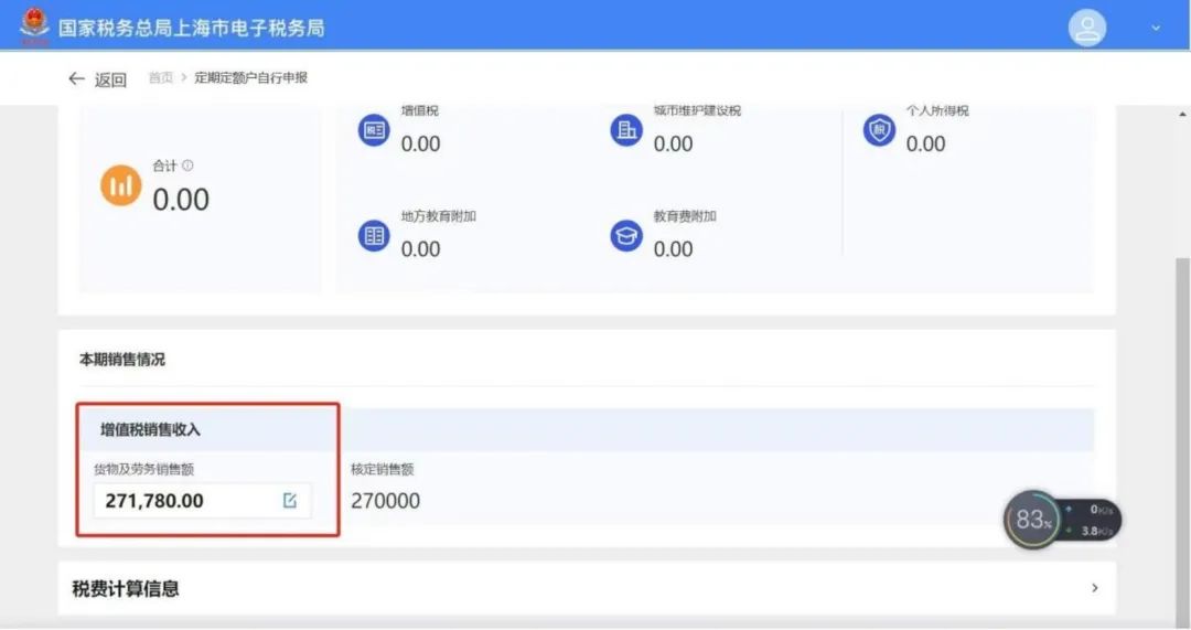 注意:税费计算信息栏默认收起,可展开查看增值税及个人所得税减免金额、预缴税额、个人所得税征收率等信息。