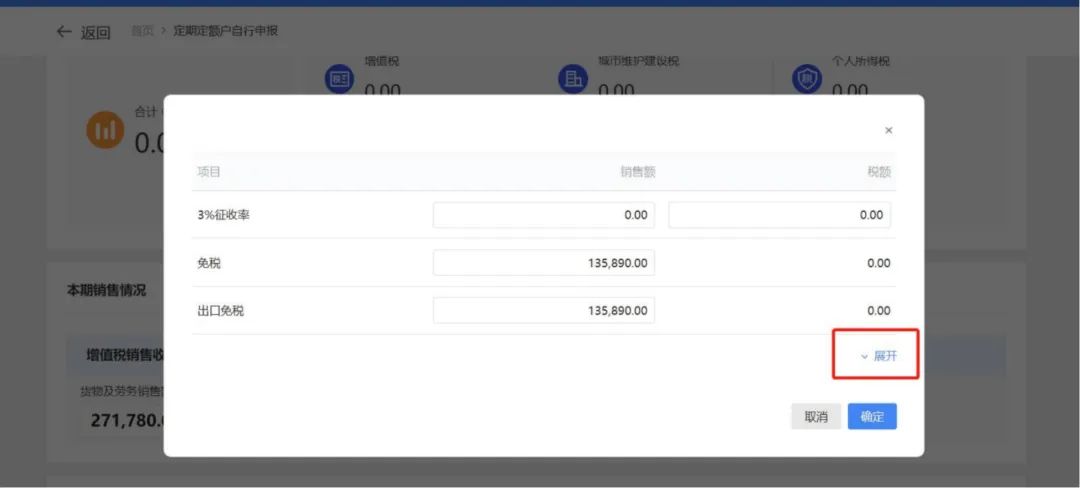纳税人确认税费是否正确,如存在未开票收入等情况,纳税人可进行补录。点击“增值税销售收入”栏中“货物及劳务销售额”改写图标,可展开,对应修改销售额,修改后点击【确定】按钮。
