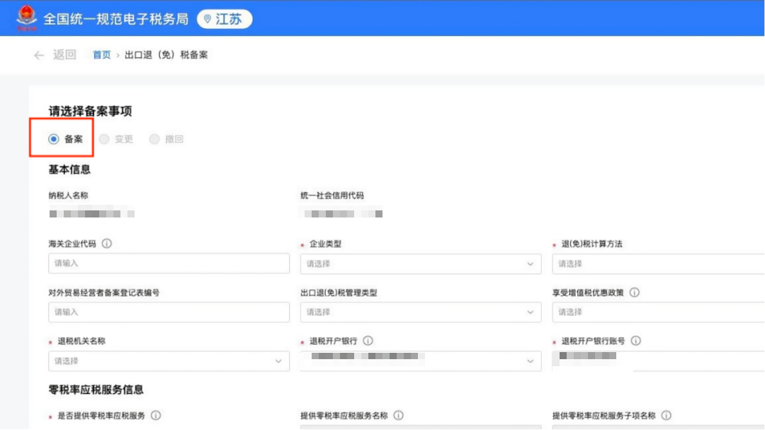 1、点击【我要办税】-【出口退税管理】-【出口退(免)税企业资格信息报告】-【出口退(免)税备案】功能菜单。系统将根据纳税人历史办税记录自动匹配备案、变更、撤回等申请模式。