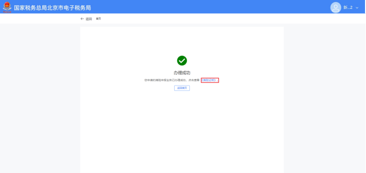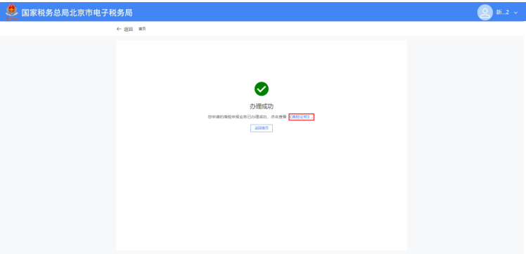 e.系统提示“尊敬的纳税人,您申请的清税申报已办理成功,点击查看《清税证明》,并在承诺期限内完成未结事项办理。”, 点击【《清税证明》】可下载清税证明,点击【返回首页】可返回电子税务局首页。