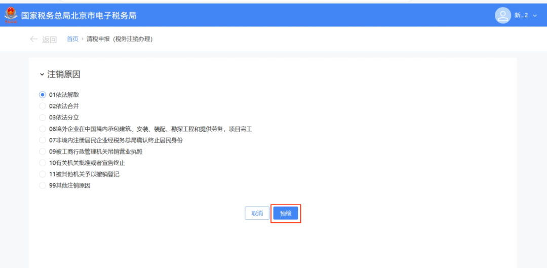 (1)注销原因为【01依法解散】、【06境外企业在中国境内承包建筑、安装、装配、勘探工程和提供劳务,项目完工】、【07非境内注册居民企业经税务总局确认终止居民身份】、【09被工商行政管理机关吊销营业执照】、【11被其他机关予以撤销登记】、【99其他注销原因】时。点击【预检】。