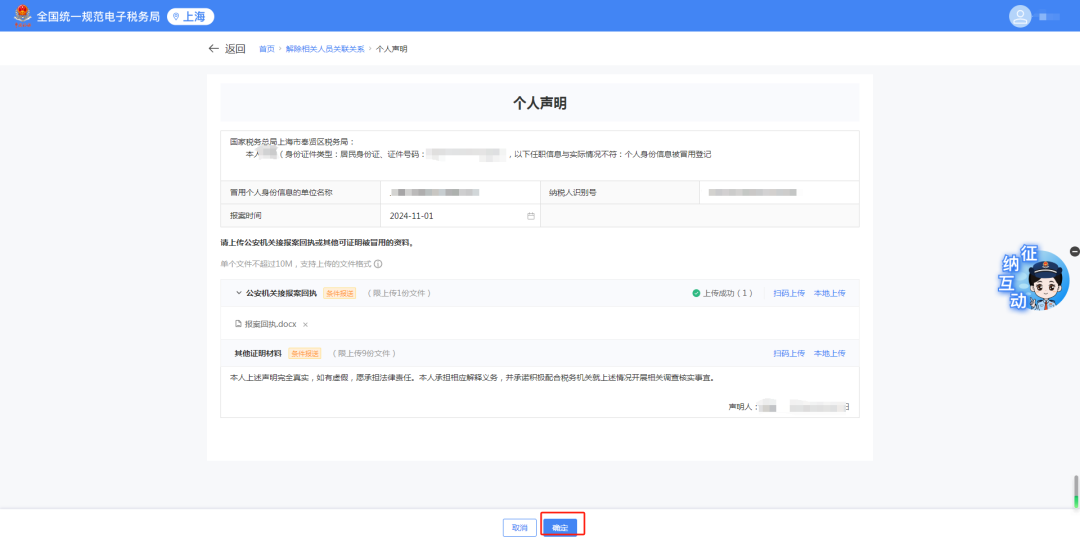 对主张身份证件被冒用的财务负责人和其他办税人员,根据其出具的个人声明、公安机关接报案回执等相关资料,解除其与纳税人的关联关系。