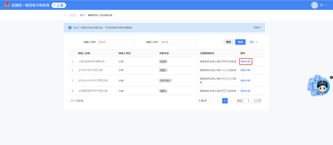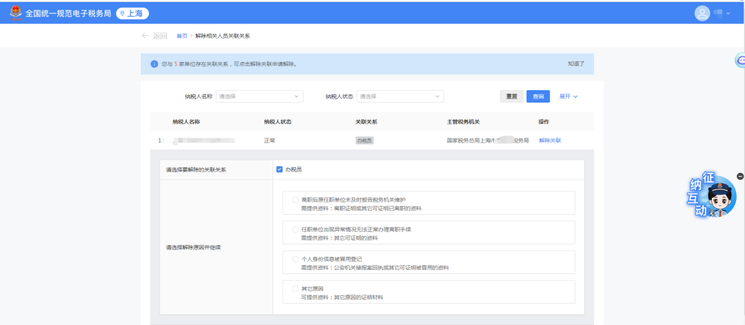 2.展示自然人关联的纳税人信息,点击【解除关联】。