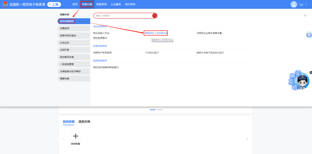 1.以自然人身份登录新电子税局后,点击【我要办税】-【综合信息报告】-【身份信息报告】-【解除相关人员关联关系】功能菜单。