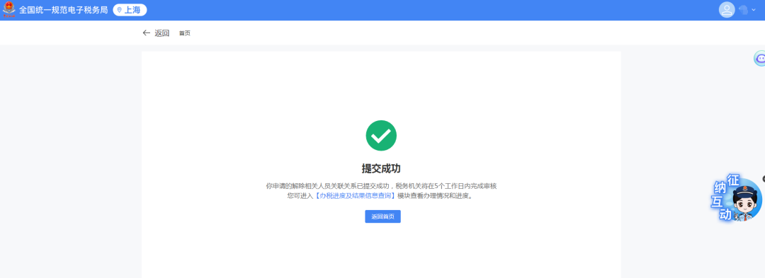 4)跳转提交成功界面,可点击【返回首页】返回电子税务局首页。