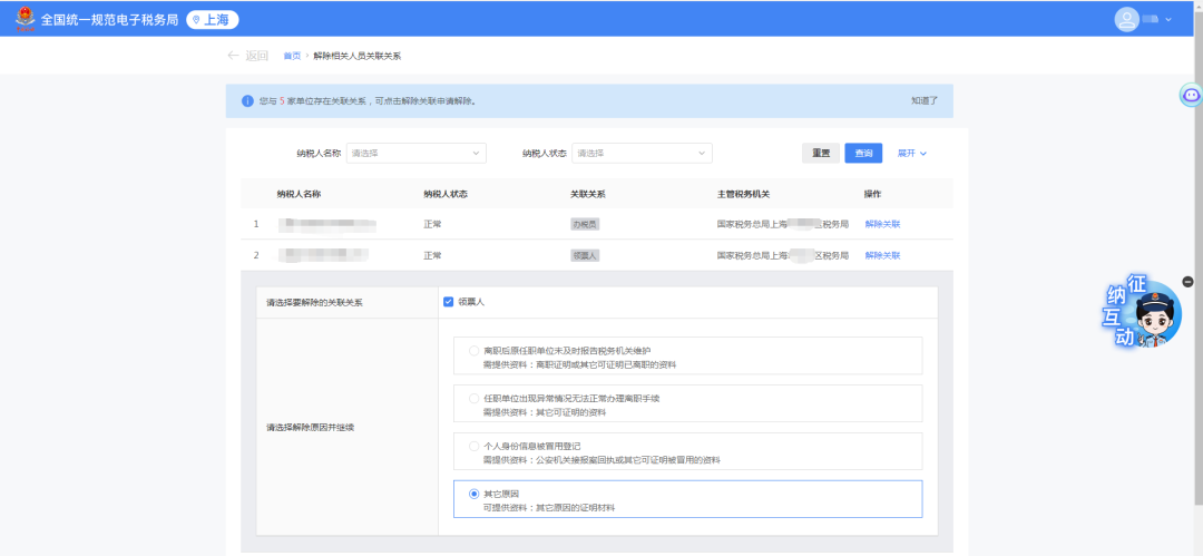 若是已离职的情况,点击选择解除原因“离职后原任职单位未及时报告税务机关维护 需提供资料:离职证明或其它可证明已离职的资料”。