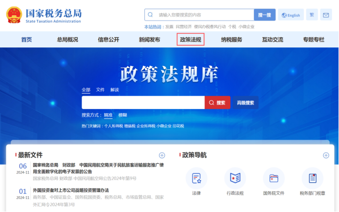 第一步:打开国家税务总局网站,点击“政策法规”模块。
