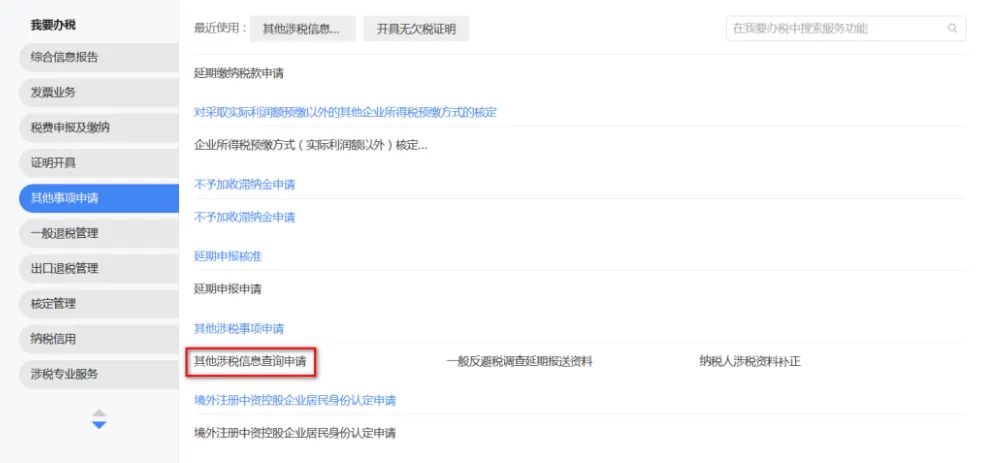 登录新电子税局后,点击【我要办税】-【其他事项申请】-【其他涉税信息查询申请】功能菜单。