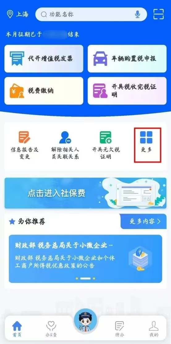 打开电子税务局App,登录后在首页点击【更多】,选择【蓝字发票开具】。