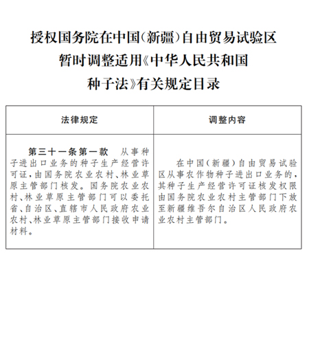 为支持中国(新疆)自由贸易试验区建设,推动自由贸易试验区试点政策落地,第十四届全国人民代表大会常务委员会第十五次会议决定:授权国务院在中国(新疆)自由贸易试验区暂时调整适用《中华人民共和国种子法》有关规定(目录附后),期限为五年,自本决定施行之日起算。