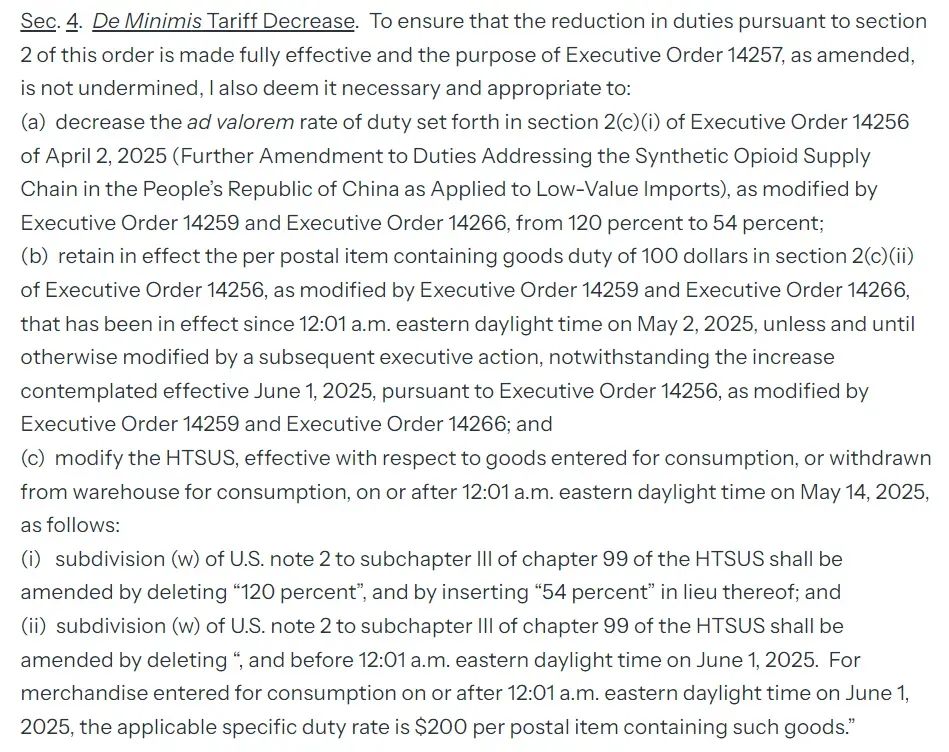 白宫发布总统特朗普修正行政命令,调整4月2日第14256号行政命令,第14259号修正行政命令和第14266号修正行政命令中规定的价值低于800美元小额包裹的从价关税税率,将从价关税税率从120%降低至54%。